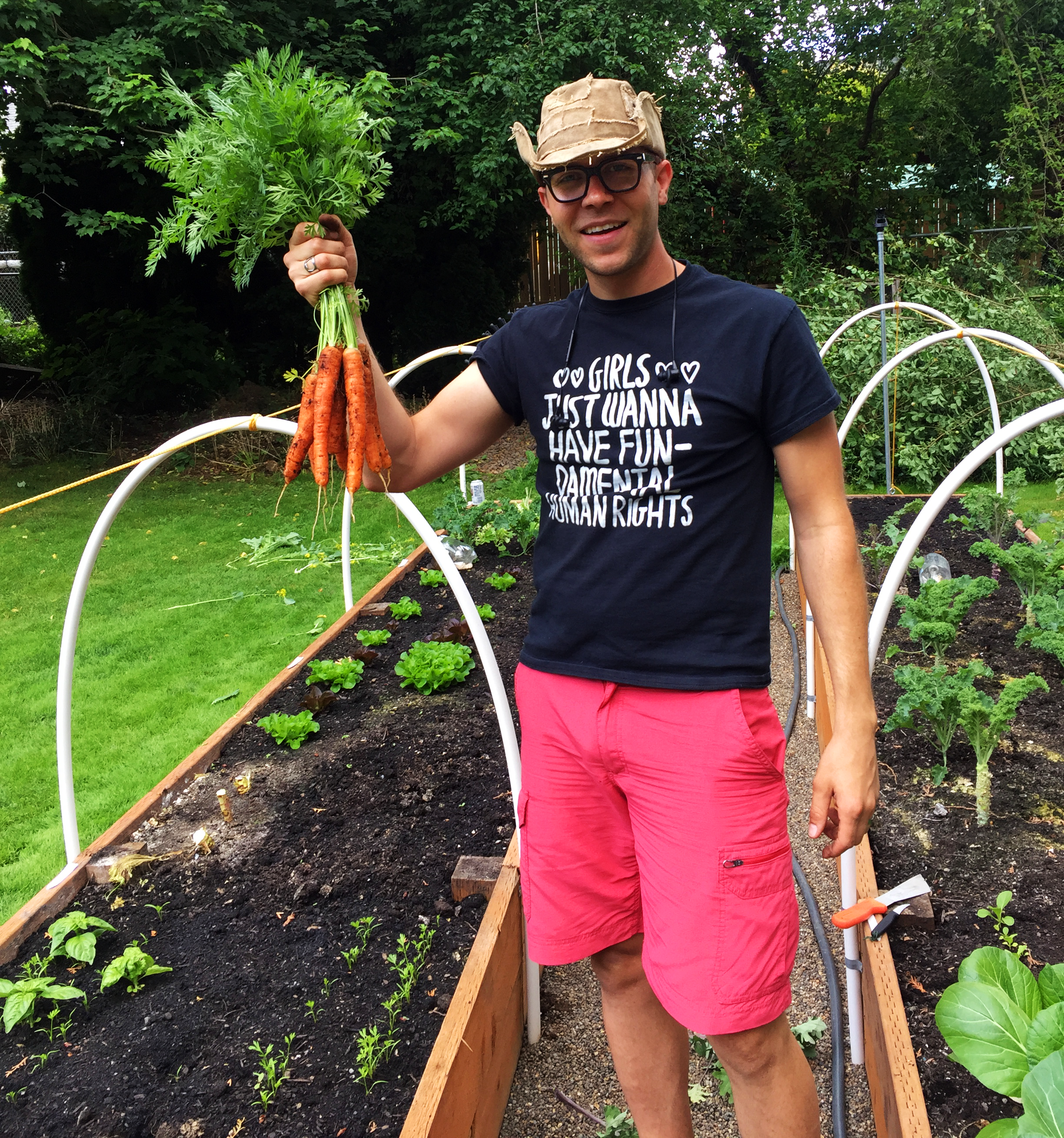 Farmer holding a bunch of orange Napoli carrots.