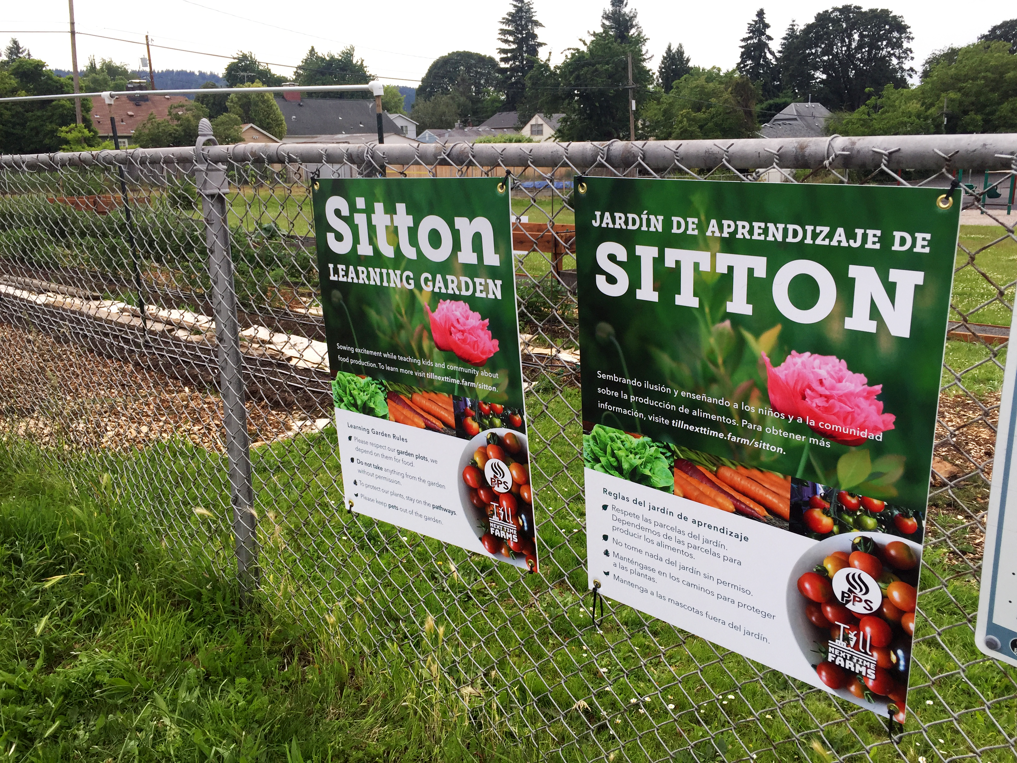 Garden Rules signs in English and Spanish